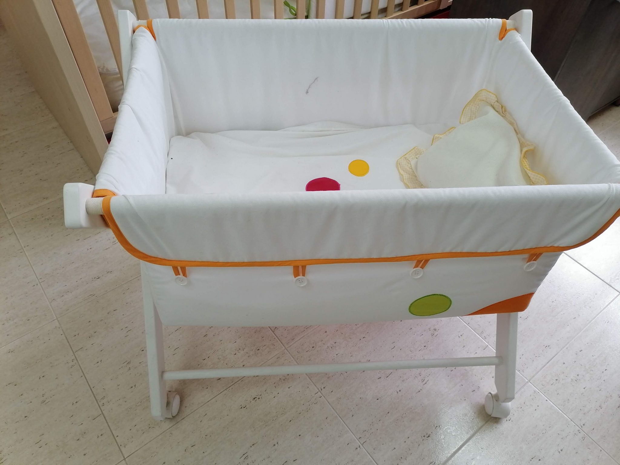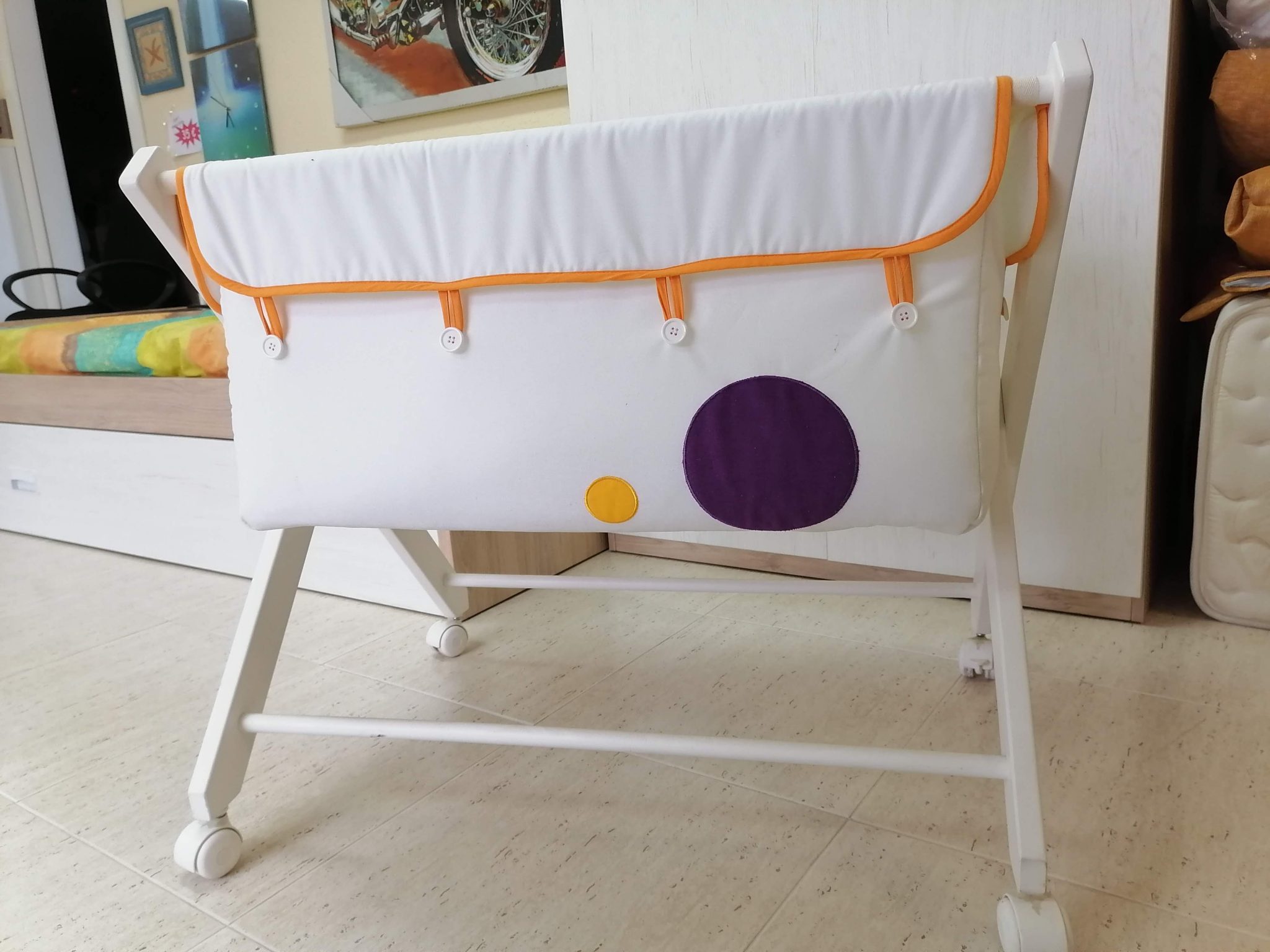 Bressol infantil de fusta lacada blanca amb rodetes per facilitar el moviment.